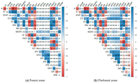 In the forest zone, the non-significant variables (p > 0.05) were MIN, MXSPD, wind speed (WDSP), Dewpoint (DEWP), SPI1, SPI3, SPI6, SPI9 and SPI12 for NF, and MIN, MXSPD, WDSP, ET0, SPI1, SPI3, SPI6, SPI9, SPI12 for SB (Figure 4a). The other variables were highly significant (p < 0.001). The most correlated variable for both NF and SB was FDI, positively correlated to wildfire activity.