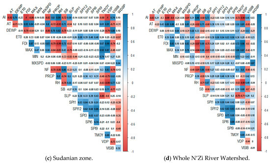 Spearman correlation matrix between wildfire variables and climatic variables in the (a) forest zone; (b) preforest zone; (c) Sudanian zone and (d) the whole N’Zi River Watershed. Significant positive correlations are displayed in blue, significant negative correlations in red and non-significant correlations are in blank (p > 0.05). The intensity of the colour is proportional to the correlation coefficients.