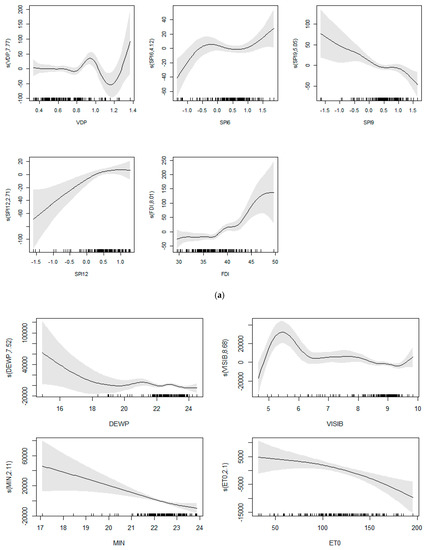 The relevant covariates were different according to ecoregions and wildfire variables. For instance, in the forest zone, different covariates were selected for models of NF and SB. For the number of wildfires, they included VDP, SPI6, SPI9, SPI12 and FDI. For the burned area, the relevant factors were TMOY, MIN, ET0, DEWP, VISIB, SPI3, SPI9 and FDI. The deviance explained for NF and SB was 84.7% and 84.2%, respectively. For this ecoregion, SPI6, SPI9 and SPI12 had relatively simple nonlinear relationships with the number of wildfires, whereas VDP and FDI had relatively complex nonlinear relationships with the number of wildfires (Figure 5a). By contrast, all the significant covariates had relatively simple nonlinear relationships with the burned areas (Figure 5b).