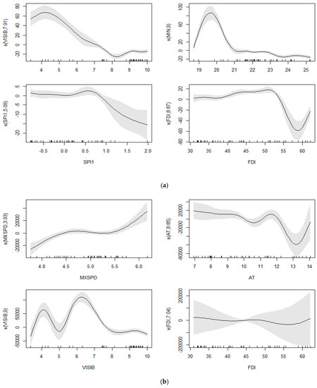 In the Sudanian zone, the deviance explained by the models for NF and SB was, respectively, 99.8% and 99.7%. In this area, the key covariates for NF included MIN, VISIB, SPI1, and FDI, while those for SB were AT, MXSPD, VISIB, and FDI. In this zone, all the significant covariates had relatively simple nonlinear relationships with the number of wildfires (Figure 7a) and the burned areas (Figure 7b).