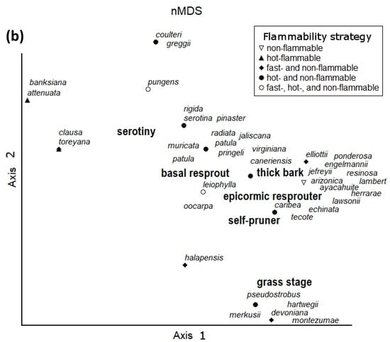 (a) Revised version of the conceptual flammability model of Pausas, Keeley, and Schwilk [20] depicting where pines with multiple fire-adapted traits fall on the three axes of variation in plant flammability, and (b) non-metric multidimensional scaling (nMDS) of fire-adapted traits for the members of the Pinus genus with (1) multiple fire-adapted traits listed in Table 1A and (2) traits for taxa with only single flammability strategy taken from Appendix 21.1 in Keeley and Zedler [26]. Species with multiple flammability strategies in this ordination were identified through an exhaustive review of the literature on Pinus. Species are plotted in trait space and are displayed according to flammability strategy via the nMDS of species by traits (i.e., presence/absence) using relative Euclidean distances and PC-Ord software [36]. The final stress for the ordination was 0.0749. While some members of the Pinaceae fall at the extremes, the ordination diagram clearly shows that many species fall at the center of the nMDS and possess multiple fire-adapted traits.