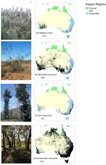 Four post-fire regeneration strategies according the classification of Nicolle (2006) (a–h): (a) and (b) obligate seeder, (c,d) lignotuber resprouter, (f) stem resprouter, and (e–h) combination resprouter for 723 taxa (species, subspecies and hybrids) within the eucalypt clade. The continental distributions of the four regeneration strategies and the tropical (green), arid (yellow) and temperate (blue) Koppen regions are shown in the maps. Photographs of each of these four regeneration strategies are also shown for (a) the obligate seeder E. regnans forest above a Nothofagus rainforest in western Tasmania (=non-flammable strategy of Pausas, Keeley, and Schwilk [19]); (c) lignotuberous ‘mallee’ E. socialis in semi-arid southeastern Australia (=hot flammable strategy [19]); (e) stem resprouting in the combination resprouter E. globulus forests in dry temperate Tasmania (=hot flammable strategy [19]); and (h) combination resprouter E. tetrodonta in tropical savanna (=fast flammable strategy [19]). The distribution data are sourced from the Atlas of Living Australia (ALA, http://www.ala.org.au. Accessed 8 December 2017). Note some hybrids listed by Nicolle [67] were not available in ALA.
