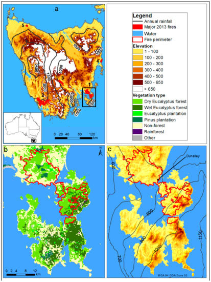 Geographic context of the Forcett-Dunalley fireground: (a) Annual rainfall (in millimetres) and elevation (in metres) across Tasmania and the location of major fires in the 2013 fire season: 1–Forcett-Dunalley; 2–Giblin River; 3–Repulse; 4–Bicheno; 5–Montumana. (b) Dominant vegetation in the Forestier and Tasman Peninsulas based on TASVEG 3.0, an integrated vegetation map of Tasmania [49]. (c) Elevation displayed as hillshaded Digital Elevation Model, and mean annual rainfall across the Forestier and Tasman Peninsulas.