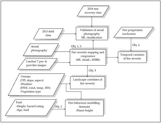 Hourly gridded weather data was obtained from a downscaled initial analysis product provided by the Antarctic Climate and Ecosystems Cooperative Research Centre, Hobart, Tasmania at 1.5 km spatial resolution [53]. These data included air temperature, relative humidity, wind speed, and McArthur forest fire danger index (FFDI) [54]. Weather data were assigned to cells based on the spatial overlap with fire progression isochrones to enable estimation of meteorological variables for each cell at the time of combustion. Grid cells were attributed with the maximum temperature, wind speed and FFDI, the minimum relative humidity, and the most common categorical wind direction within them. All spatial analyses were performed in ArcGIS 10.3 [55] (data harmonization and GIS analysis) and ERDAS Imagine 2016 [56] (image processing) while statistical analysis was done in R version 3.4.0 [57] software. To provide a temporal context for the fire, non-gridded FFDI (calculated from 30-min weather data including temperature, relative humidity, wind speed, and soil moisture), and soil dryness index (both obtained from the nearby Hobart Airport and Stroud Point automatic weather stations during and before the fire event were plotted. A schematic workflow of the overall methodology is provided in Figure 2.