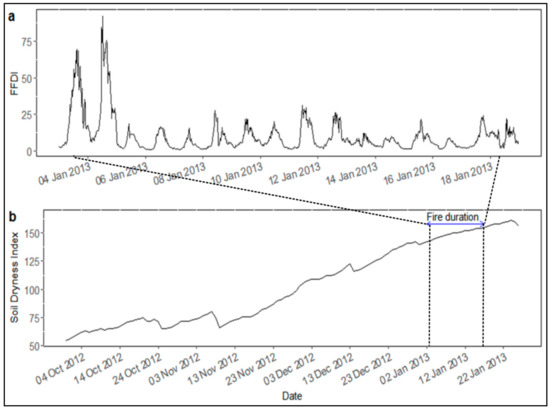 Temporal trends of fire weather and drought: (a) forest fire danger index (FFDI) for the duration of the fire, calculated from 30-min weather data (temperature, relative humidity, wind speed, and soil moisture) from the nearest automatic weather stations (Hobart airport and Stroud Point stations). (b) Soil dryness index (SDI) also obtained from the Australian Bureau of Meteorology, three months before and during the fire. The period of the fire is indicated by dashed lines and the double arrow.