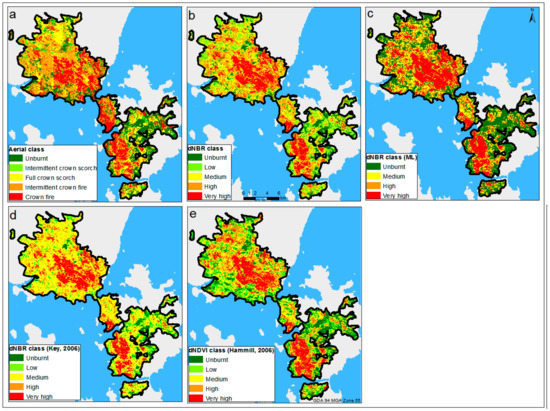 Fire severity maps of the fire from: (a) a classified aerial photo using maximum likelihood classification method, and (b) dNBR using class thresholds generated based on knowledge of fireground, (c) maximum likelihood classification of raw dNBR, (d) using dNBR class ranges used by Key and Benson [67] for western U.S. forests, and (e) using dNDVI class ranges used by Hammill and Bradstock [10].