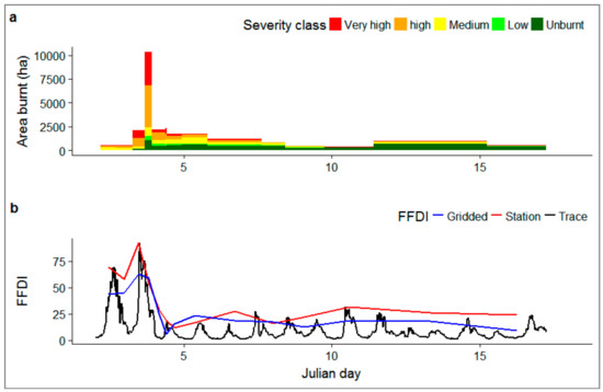 Summary of fire severity and fire weather during the fire. (a) Temporal variation of the five fire severity classes. The width of block in the x-axis corresponds to the duration of isochrone. (b) FFDI is displayed in three ways: (1) gridded FFDI corresponding with midpoint time between two consecutive fire isochrones, (2) station FFDI obtained from the nearby meteorological station, which correspond with the midpoint time between the fire isochrones, and (3) trace FFDI, which is raw FFDI as recorded at the nearby meteorological station.