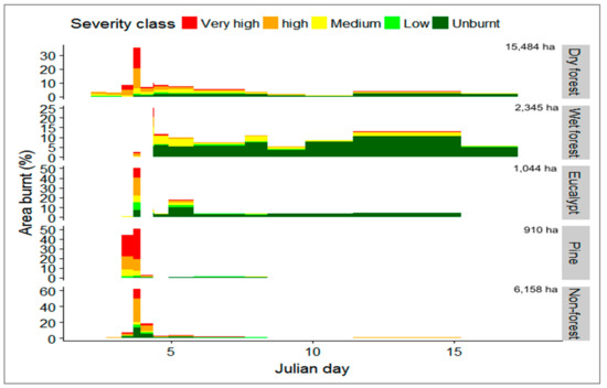 Fire severity patterns varied amongst vegetation types, with the highest severities occurring in dry Eucalyptus forest, Pinus plantation (that occupied a small area within the fireground), and non-forest vegetation (Table 4 and Figure 5a). Non-forests showed higher severities because their reflectance values were similar to those of severe fires in the forests. By contrast, wet forest had the largest unburnt area and smallest area burnt under extreme fire severity. During the initial days of the fire, dry sclerophyll forest in the northern sector of the fireground burnt under severe FFDI conditions, whereas most of the wet forests that dominate the southern sector and are capable of sustaining extremely intense fire intensities, burnt under lower FFDI values.
