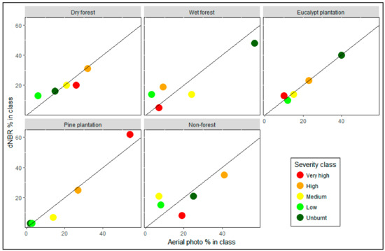 Scatterplot of percentage area of each severity class in each vegetation type in aerial photographic classification relative to the percentage of each class in the dNBR map. The 1:1 line shown in the graphs represents situations where corresponding points between the aerial photo and dNBR data are equal.