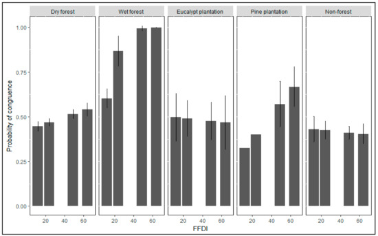 Predicted probability of congruence of aerial photography and dNBR maps from AIC analysis of the best model based on the interaction between vegetation and FFDI (Table 6a). The bars represent the prediction of congruence for increasing FFDI classes (low FFDI = 11, high FFDI = 24, very high FFDI = 49, and severe = 64).