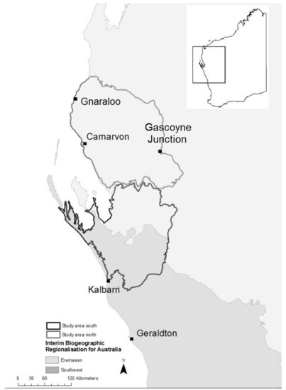 Given the large size of the study area in arid Western Australia (65,725 km2), and because of the substantially different vegetation types and weather patterns across this area, it was divided into northern and southern sections. The study area and two sub-areas (Figure 1) were chosen as they: (1) Have relatively consistent seasonal rainfall patterns, although the annual rainfall is changing; (2) correspond closely to a recognised biogeographic region (the Carnarvon bioregion) and geological province (Carnarvon Basin, a sedimentary basin of mostly sandstone and limestone of Palaeozoic to Mesozoic age and overlying sediment); (3) have not been previously studied in terms of fire regimes; and (4) have natural fire boundaries including rivers (northern, southern and central boundaries), salt flats, major geological formations and hills (eastern boundaries), coastal sand dunes and coast (western boundaries). The Wooramel River creates a significant natural fire boundary between the northern and southern study areas.