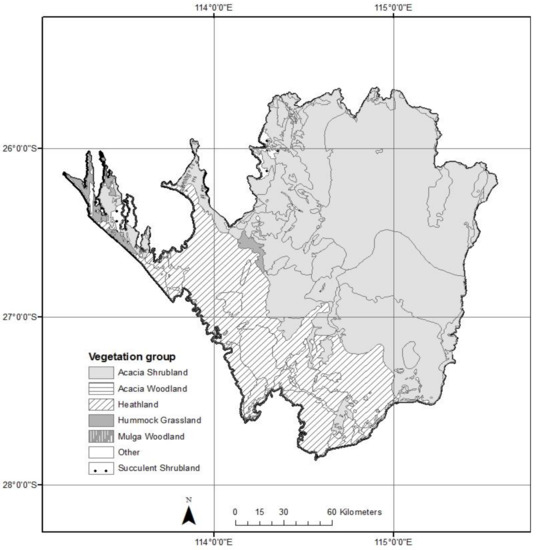 The study area has two main types of vegetation; hummock grassland (primarily Triodia spp.) and wooded shrublands (primarily Acacia spp. over generally sparse herbaceous understorey), creating a mosaic landscape with some succulent-plant shrubland interspersed throughout, all of which are typical of arid and semi-arid Australia [23]. There are 141 different vegetation associations mapped in the study area [38] (Table S1). To evaluate the effect of vegetation on bushfires, we combined the vegetation associations into seven broad groups (Figure 2 and Figure 3; Table 1 and Table S2): Acacia shrubland, Acacia woodland, heathland, mulga woodland, hummock grassland, succulent shrubland, and other. The groupings were based on the original association descriptions [38] and the National Vegetation Information System (NVIS) level 1 classifications and locations, and corresponds closely with the physiognomic vegetation types groups recently redefined and mapped by Beard et al. [39] at the 1:3,000,000 scale. Mosaics and mixed vegetation associations were placed into one of the seven vegetation groups based on their ground or lowest vegetation stratum (as this was deemed to have the largest influence on fire behaviour and patterns).