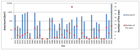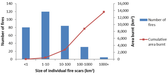There were six years with no new bushfire scars detected, and two years (1980 and 1985) with no usable satellite imagery (Figure 4). The mean size of individual (disjunct) fire scars for the study period was 40.9 km2 with the median being 3.95 km2. The fires ranged in size from less than 1 km2 to more than 4000 km2 (Figure 5). The average count of separate fire scars per year was 9.4 with a range of 0–45 year−1, and there were 300 in total across all 39 years studied. The total area burnt (including areas that burnt more than once) during the study period was 15,646 km2 out of a total study area of 65,725 km2, which represents 23.8% of the study area. The yearly average for area burnt in the southern study area was 0.6% of the total area or 169 km2 year−1. The yearly average for the northern study area starting from 1988 was 1.9% of the total area or 447 km2 year−1. There was a very large bushfire in the northern study area in 2012, which accounts for substantially greater than normal area burnt for that year (Figure 4 and Figure 5). Some 8698 km2 burnt in 2012 (Figure 6), around eight times larger than the next largest burn year (1978) in which 982 km2 burnt. In 1996, some 45 separate fire scars were recorded but only 151 km2 burnt that year. Pearson’s correlation showed a weak correlation (r = 0.26; p = 0.11) between scar numbers and total area burnt each year.