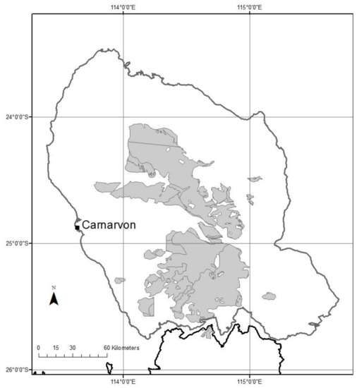 The area spans a transitional rainfall zone, changing from a semi-arid Mediterranean climate (i.e., with summer drought) in the south, to arid climate with bimodal rainfall distribution (both summer and winter rain) in the north [35,36]. The average annual rainfall of the study area gradually declines with distance north and east, ranging from 346 mm year−1 at Kalbarri to 233 mm year−1 at Gnaraloo, and 215 mm year−1 at Gascoyne Junction [37].