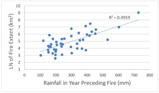 Moderately strong and statistically significant positive correlations were found between cumulative rainfall in the previous year and fire size for both study areas (Table 3), although the logarithmic relationship was a better fit for all fires across the whole study area (Figure 7; r2 = 0.50 compared to 0.33 for linear fit). The only other significant correlation with fire size was cumulative pre-fire water deficit (P-E) in the year prior to fire (less water deficit corresponding to bigger fires for northern study area only; Table 3). Multiple linear regression showed that rainfall in the year preceding fire was prominent in all the best (most parsimonious) models explaining variation in fire size (both untransformed and log transformed; Table 4). The models for the southern study area also included rainfall in three months prior to fire (with a negative coefficient), suggesting the combination of a wet period followed by shorter dry period best explained variation in fire size. Temperature in months before the fire made a small contribution to improving models in the northern study area, with mean maximum temperature in three month before fire being positively linked to log-transformed fire size in the context of the model (Table 4).