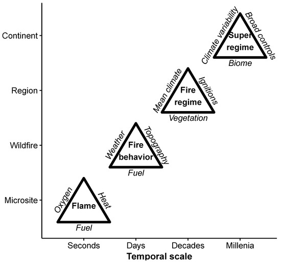 Four scales of control relevant to wildland fire. Many authors represent controls at each scale with triangles; this figure is a modified version of the modified version presented by Scott et al. [2]. While these triangles together encompass most sources of biotic and abiotic variability in the wildland fire environment, the model fails to incorporate human dimensions of wildland fire.