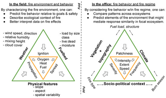 The field arena highlights elements of the fire environment and fire behavior that must be measured and reported to ensure research can be translated and management actions are safe and effective. Fire behavior—ignition, propagation, and spread—occurs at the interface of the fine-scale flame triangle—oxygen, heat, and fuel—and the environmental variables of the landscape-scale fire behavior triangle: weather, fuelbed, and physical features that describe the terrain (Figure 2 left). Each side of the outer (fire behavior) triangle in Figure 2 includes several variables whose measurement and inclusion facilitate robust fire science. These data aid in the interpretation and transferability of wildland fire research, as they provide important context about the fire environment and fire behavior to support better interpretation and application of results.