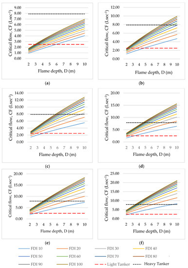 Illustrated in Figure 1a–f, critical flow (CF) rates per 10 m section of active head fire range from 0.94 Ls−1 in a 2 m deep active flame front through understorey fuels of 5 tha−1 at a FDI of 10 through to 21.10 Ls−1 in a 10 m deep active flame front through understorey fuels of 30 tha−1 at an FDI of 100. Note: As described above, this study assumes appliances and aircraft can apply a uniform pattern of water to a 10 m length of active head fire front and the results are presented on this basis.