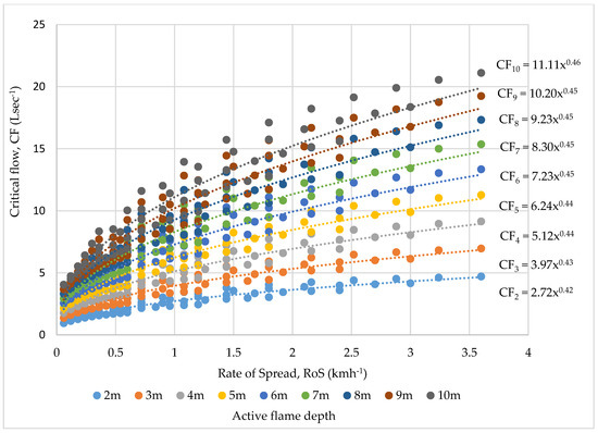 Critical flow rates at various active flame depths, CFD (Ls−1), as a function of head fire Rate of Spread, RoS (kmh−1).