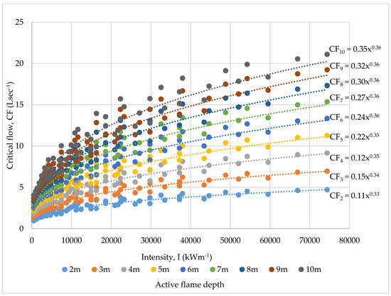 Critical flow rates at various active flame depths, CFD (Ls−1), as a function of intensity, I (kWm−1).