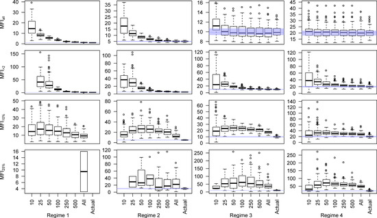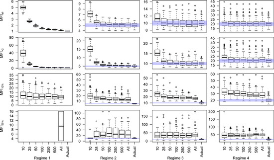 Box and whisker plots of tree-ring reconstructed mean fire interval (MFI) measurements (y-axes) by fire regime (columns), filter level (rows), and by sample size (x-axes) for targeted sampling strategies. The shaded region is the range of actual fire-intervals experienced across all 100 simulations for that fire regime. Note that MFIall accurately describes all fire regime at 50 or fewer samples. Note also that when filtering the fire-scar record at 10% or 25% level, targeted sampling regimes never accurately describe any of the fire regimes.