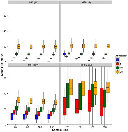 The unfiltered MFIall is rarely used in dendroecological studies, however, for fear that it over-represents the importance of small fires. Consequently, the filtered MFI10% and MFI25% are more commonly used to infer fire frequency [37]. As our results indicate, the targeted sampling strategy stabilizes at smaller sample sizes relative to probabilistic sampling. However, even for spreading fire regimes (decadal and bidecadal spreading fires), in which the filters should be expected to best replicate the actual fire history, the filtered MFI10% and MFI25% metrics artificially and systematically underrepresent actual fire frequencies, returning MFI values that are roughly 150%–300% of their true value. Perhaps more problematically, at the 25% filter, the three fire regimes become more difficult to distinguish even with a complete census of fire-scarred material (Figure 3). The most liberal, but least utilized filter, MFI2, seems to provide the best compromise for removing uncorroborated, singleton fire-scars while still accurately describing the real fire history (Figure 1, second row) and distinguishing contrastive fire regimes (Figure 3) at modest sampling intensities (0.25 trees ha−1). This analysis suggests that if a study area is sufficiently well surveyed in advance, targeted sampling of roughly 0.25 trees ha−1 should be sufficient to distinguish fire regimes with different MFI. Rather than improving the representativeness of the fire-scar record, probabilistic sampling seems to dilute the sample, making it much more difficult to accurately describe landscape fire intervals with reasonable sample sizes (cf. [37]).