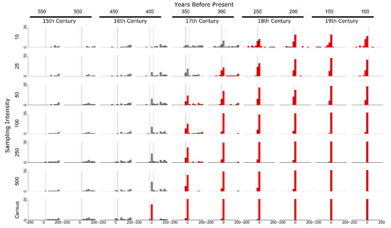 Histograms of inferred regime shifts from moving t-tests relative to the known regime shift date in Scenario 1 (shift from annual patch burning to bidecadal spreading fires). Columns are for the date before the end of the model run when the forced regime shift happened. Corresponding centuries in the real world are shown for comparison to fire-scar studies. Rows are for different sampling intensities. Red histograms denote scenarios where the majority of the regime shift simulations (>20 model runs) were accurately identified. Note that recent regime shifts are accurately predicted at all sampling intensities. Greater sampling intensities are needed to identify regime shifts further in the past but even census level sampling does not correctly identify regime shifts that are beyond the typical lifespan of the modeled tree (400 years, see Appendix A).