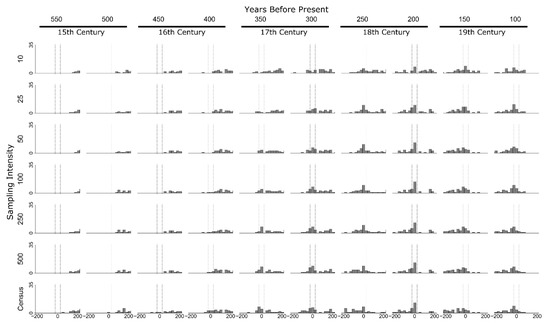 Histograms of inferred regime shifts from moving t-tests relative to the known regime shift date in Scenario 2 (shift from semidecadal patch burning to decadal spreading fires). Columns are for the date before the end of the model run when the forced regime shift happened. Corresponding centuries in the real world are shown for comparison to fire-scar studies. Rows are for different sampling intensities. Note that in no scenario does the statistical regime shift detection correctly identify the regime shift for the majority of simulations (>20 model runs; these histograms are indicated in red in FIGURE 4), even at total census level sampling and for recent regime shifts.
