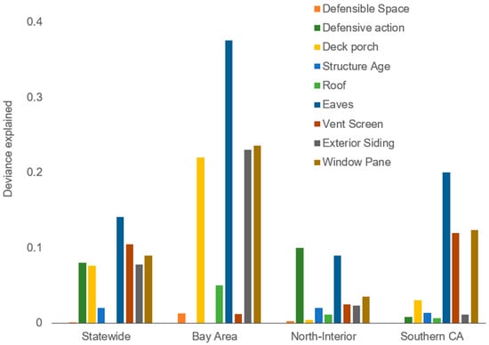 Deviance explained for building inspection variables statewide in three California regions. Defensive action and structure age were only available for North-Interior and Southern CA.