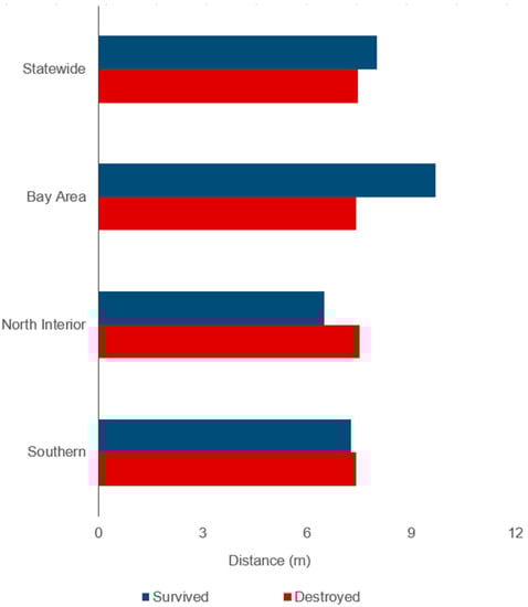 The relative importance of defensible space, as quantified by deviance explained in the regression models, was virtually nil statewide, and the only region in which defensible space had a deviance explained of at least 1% was the Bay Area (Figure 1). Statewide, home survival was associated with slightly longer average distances of defensible space, and this distinction was more pronounced for the Bay Area (Figure 2). On the other hand, when averaging mean values of defensible space classes across survived and destroyed homes, there was a slightly higher mean defensible space distance for destroyed structures in the North-Interior, and virtually no difference in Southern CA (Figure 2).