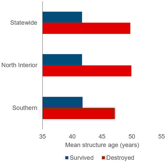 Mean age of structure for survived and destroyed homes in two California regions. The statewide calculations are based on combined totals of both regions (i.e., the Bay Area did not include this variable).