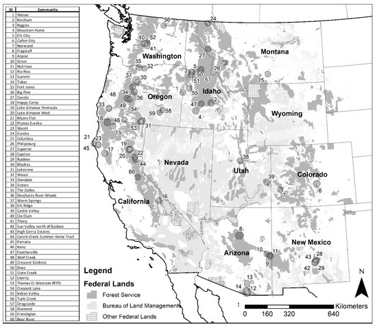 Study area map showing federal lands, interstate highways, and 60 communities located in 9 western US states. All communities in the sample had experienced a large fire within the last decade.
