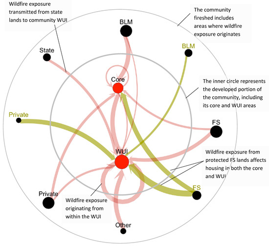 We then summarized annual average housing unit exposure by ignition source for each community landscape to describe the sources of wildfire that expose communities and their surrounding WUI to the wildfire threat. We illustrate community exposure using network diagrams that show the transmission of wildfire between different land tenure types and the WUI and community core polygons (Figure 2). Network graphs were used to estimate the complexity of each community’s wildfire exposure network, where complexity was defined as the number of land tenure sources that contributed to community and WUI wildfire exposure. We used the complexity variable as an independent variable for subsequent analyses.
