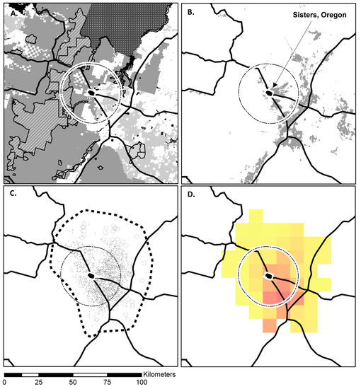 Fireshed data for the community of Sisters, Oregon and surrounding landscape showing (A) land tenure including US Forest Service (dark grey), Bureau of Land Management (light grey), tribal lands (stippled), private land (white), and management areas that restrict mechanical fuels treatments (hashed), (B) WUI and developed areas (grey), (C) simulated large fire ignitions that grow to less than 100,000 ha (small dots) and greater than 100,000 ha (circles), and minimum convex polygon of fireshed area (dashed line), and (D) 10 km grid of exposure transmission where darker cells transmit fires that create more exposure to Sisters and nearby WUI than lighter grid cell.