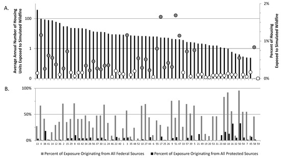 Community exposure to wildfire measured by (A) the average annual number of housing units predicted to be exposed to simulated wildfires (bars) and the corresponding percentage of the total housing units exposed (dots: white are below the median exposure, grey are above), and (B) the percent of exposed housing units for which simulated ignitions originated on federally managed (grey bar) and protected lands (black bar). Numbers below the x-axis represent the community number in Figure 1.