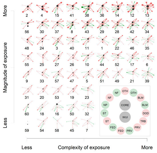 Community wildfire exposure networks arranged in terms of exposure complexity (x-axis) and overall exposure (y-axis) demonstrates a general relationship of increasing exposure with increasing exposure complexity. The top row represents the nine highest exposure communities arranged from left to right from least to most exposure complexity. Each exposure source is arrayed in a circle around the community core and surrounding WUI (black dots in each exposure network) as depicted in the legend on the lower right. Edges between the community core, WUI, and surrounding nodes represent exposure transmission pathways from various land tenure sources, with NF = National Forests, NP = National Park, ST = State, PRV = Private lands, TRB = tribal, DOD = Department of Defense, BLM = Bureau of Land Management, FED = Other federal lands, and OTH = Other non-federal public lands. Green nodes are exposure sources that are protected and restricted from mechanical treatments, and red nodes are manageable. Arrangement of exposure sources on legend diagram is the same as arrangement for all exposure networks. The numbers below each exposure network represent the community number in Figure 1.