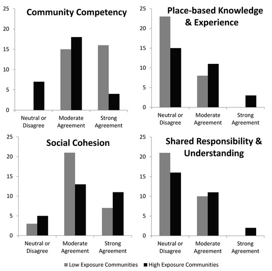Comparing community capacity indices among high and low-exposure communities exhibited significant differences in three indices (α < 0.10). Community competency exhibited substantially different patterns in score distribution between high and low-exposure communities (t-statistic = 3.96, p-value < 0.001). Informants in high-exposure communities were more likely to be neutral or disagree with community competence statements, whereas key informants from low-exposure communities were more likely to strongly agree with those same statements (Figure 6). Key informants from high and low-exposure communities also exhibited significant differences in their ratings of place-based knowledge and experience statements (t-statistic = −2.10, p-value = 0.04) and shared responsibility and understanding statements (t-statistic = −1.88, p-value = 0.07). However, although the magnitude varied between respondents from high and low exposure communities, the pattern was similar with plurality scoring in the neutral to disagree range. The social cohesion index exhibited no significant differences between key informants from low and high-exposure communities (t-statistic = −1.13, p-value = 0.27).
