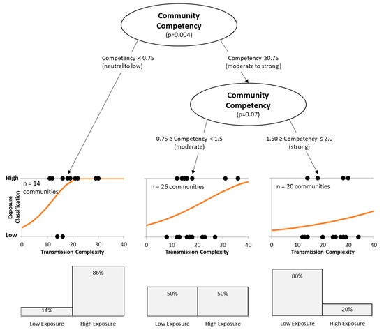Logistic regression tree for the community wildfire exposure data. Tree branches divide communities into low, moderate, and high community competency to address wildfire risk, as assessed by community key informants. The relationship between transmission complexity and exposure classification is shown with bivariate scatter plots (dots) and regression line. Bars plots (bottom) show the percent of communities classified as high and low exposure communities within each branch.