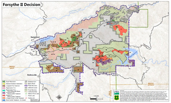 - Forsythe II Project: Changes from Initial Proposal to Project Decision. Boulder Ranger District, Roosevelt National Forest. Boulder and Gilpin County, Colorado, 2017. Available online: https://www.fs.usda.gov/Internet/FSE_DOCUMENTS/fseprd549689.pdf (accessed on 23 December 2019).