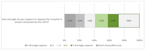 The intent of this study was to evaluate the extent to which the vocal opposition to the USFS’s Forsythe II project represented the views of the broader population surrounding the project area. This work was undertaken in light of a broader study that sought to illuminate local understandings of forest resilience in light of controversies surrounding the project. The qualitative portions of the broader study helped us gain an initial understanding of the ways in which those who opposed the project formulated and articulated their arguments in opposition. The first phase of the study allowed us to better understand the core dimensions of forest attitudes for residents engaged in the debate over Forsythe II. These arguments have continued, regardless of the concessions made by USFS. Those who opposed Forsythe II were not simply pursuing a contrarian agenda; rather, their framing of the planned work likely reflected differences in understandings of the relationship between humans and the management of natural resources. It is possible that no compromise by the USFS on the details of the project plan could ameliorate these differences [18,53].