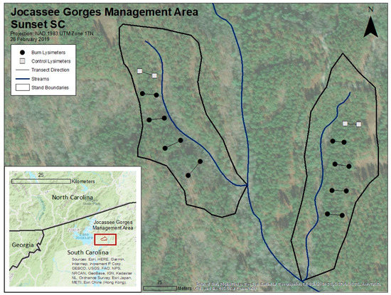 Prescribed fire is annually applied to nearly one million forested hectares in the Southeastern United States, where it is largely effective at accomplishing landscape scale management objectives [1,2]. Prescribed fire is a valuable tool for forest managers and is understood to benefit the long-term functions of many fire-adapted ecological communities [3,4]. Yet contemporary knowledge on the immediate effects of prescribed fire on nutrient cycling and sub-surface water quality in managed timber crop forests remains limited in the Southern Appalachian Mountains, where it is practiced extensively to meet productivity and forest health objectives [1,5,6]. Forested watersheds in the Southern Appalachians are important sources of clean water for rural and urban populations and are often managed to provide such services while, in many cases, still meeting timber crop productivity objectives [2,7]. Both human and natural disturbances can affect forest hydrology and water quality, and the environmental impact of these effects is driven by site-specific properties such as fuel type and quantity, topography, and seasonality [8]. Due to the powerful role of fire in shaping both terrestrial and aquatic communities in the Southern Appalachians, sub-surface macronutrient pools, such as nitrogen (N) and phosphorous (P), are a sensitive indicator of ecosystem response to disturbance [9,10].