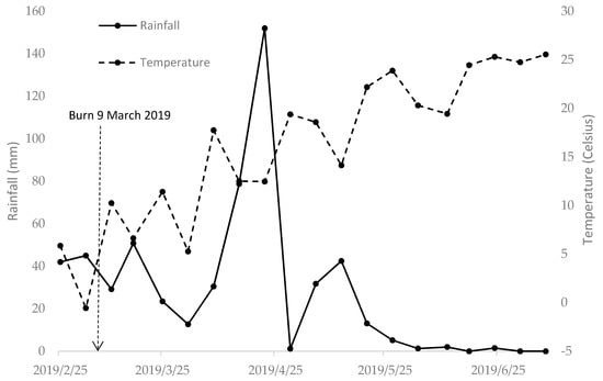 The prescribed fire in this study resulted in low-severity burns, consistent with the management objective to reduce understory woody vegetation and fuel loads. The litter layer was partially consumed but the underlying duff layer experienced minimal charring. Litter was retained in gully bottoms and burning was minimal in other moist or shaded areas, which is characteristic of low severity fire [19]. Post-fire grass and herbaceous vegetation regeneration was rapid in burned sites at the onset of the growing season in May 2019. Mean weekly rainfall during the study period was 28.9 mm. Temperatures ranged between 0 °C and 26 °C during the study period from February to July (Figure 2). The prescribed fire increased the five-month maximum NH4+, PO43- relative to control. The five-month mean pH was greater in burned transects than the control (Table 2).