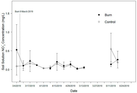 This study documented a pulse of NH4+ immediately following the application of low-severity prescribed fire. The NH4+ increase echoes similar studies’ results that also reported increased NH4+ in stream water or soil solution after burning [13,14,32]. A likely explanation for this increase is that volatilized N contained in the ash layer leached downward, allowing NH4+ to pool in the soil until it was either absorbed by plants, adsorbed to negatively charged clay particles or transformed into NO3- [5,15,33]. The decline of NH4+ in burned transects to near control values (<0.2 mg/L) between the third and fourth week of sampling (25 March–1 April, 2019) suggests that rapid nitrification and mineralization of available NH4+ occurred at the start of the growing season [11,34]. High clay content at the intersection of the A/B soil horizon in southern Appalachian soils prevents NH4+ leaching and elevated NH4+ pools can function as a source for both plant uptake and conversion to NO3-. Understory herbaceous vegetation growth starting in early May 2019 likely played a key role in limiting the pulse of NH4+, as the prescribed fires conducted at the end of or during the growing season may result in an extended period of elevated nutrient pools in the absence of plant regeneration or microbial activity [5,7,14,35]. For example, Bêche et al. [24] recorded elevated NH4+ in stream water for nearly 12-months after a prescribed fire conducted in October at the onset of the dormant season.