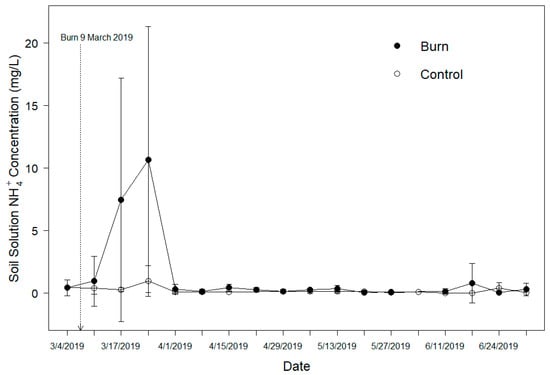 Soil solution samples were collected weekly starting in February 2019 (approximately two weeks before the prescribed fire) and continued through July 2019 (approximately 16 weeks post-fire). Soil solution samples were immediately analyzed for pH, NH4+, NO3-, and PO43- concentrations using a FIAlab Flow Injection Analyzer-1000 (FIAlyzer) (FIAlab Instruments Inc., Seattle, WA, 2018). Ammonium concentrations were measured using the Environmental Protection Agency (EPA) recommended FIA-012 gas diffusion and salicylate method. Nitrate concentrations were measured using the EPA compliant FIA-026 Cadmium reduction ASTM 4500-NO3-I method. Phosphate concentrations were measured using the EPA compliant FIA-073 automated ASTM 4500-P G-199 method [27]. Sample pH was measured using Hanna Instruments HI9814 probe (Hanna Instruments, USA, 1978–2020). Samples were stored in a freezer after analysis. Lack of solution for 12 lysimeter samples was attributed to low precipitation and soil water uptake by regenerating plants starting in May 2019.