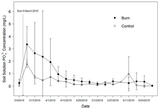 Phosphate concentrations increased in burn transects relative to control transects. The five-month maximum PO43 concentration (6.57 ± 0.2 mg/L) in burn transects was approximately three times greater than control (1.9 ± 4.0 mg/L) and this difference was significant (t6.2 = 2.84, p = 0.029). There was no difference (F1,14 = 0.74, p = 0.400) between pooled weekly burn and control concentrations during any sampling event. Elevated PO43- concentrations (>1.0 mg/L) were measured for five weeks post-fire and did not experience a notable return to baseline concentrations until the final sampling event, contrasting the NH4+ behavior, though there were low (<0.1 mg/L) concentrations recorded in burned samples throughout the sampling period (Figure 5).