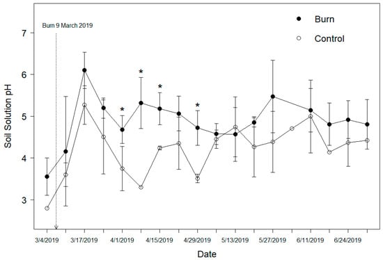 Soil solution pH sampled from March 2019 to July 2019 in a yellow pine forest in the Southern Blue Ridge Mountains of South Carolina. Values are weekly means with standard error bars. Weekly burn measurements denoted by an asterisk (*) are significantly greater than the control at the 0.05 significance level.