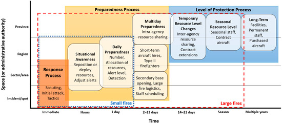Daily decision-making environment for wildland fire management in Ontario (adapted from [14,15,16]). The decision space for fire response takes place within the dashed boxes depending on the size, duration, impact, and complexity of the fire.