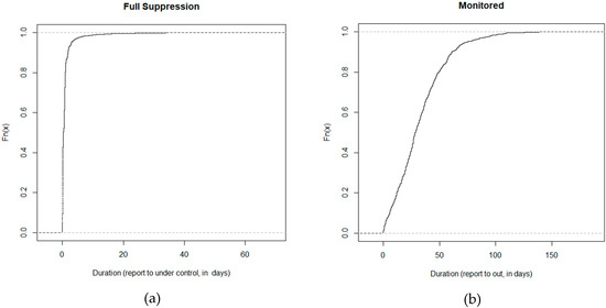 Empirical cumulative distribution functions of fire duration (1990–2019) in Ontario, Canada, for: (a) Full suppression fires; (b) monitored fires. Duration is the time in days between reporting and being called “under control” for full suppression fires, or “out” for monitored fires. After data cleaning, there were 15,737 full suppression fires and 1457 monitored fires.
