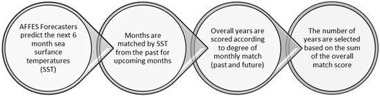 To select the historical analogue years, each year was given an SST pattern match score between 0–1. A “Score Sum”, which is a threshold value for the added match scores of the individual years, was preselected (currently we use 2.1). Years were selected starting from the highest-scoring year, until the sum of their match scores reached the Score Sum (Figure 5). The number and ranking of years selected varied, depending on the current and predicted SST values over the next six months. This made the long-term forecast dynamic rather than static, as would be the case if all historical years were used.