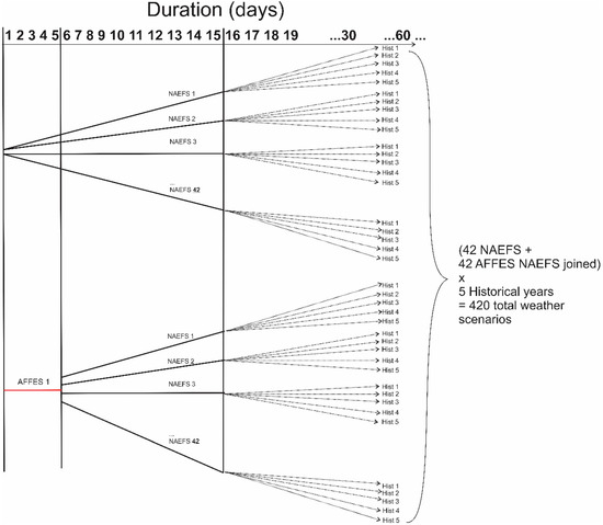 The historical weather data from each selected historical analogue year were appended to each endpoint of the forecast ensemble members (AFFES and AFFES + NAFES) after day 15. The total number of final weather scenarios depended on how many historical analogue years were used. The result was a variable number of weather scenarios that can number in the hundreds (Figure 6).